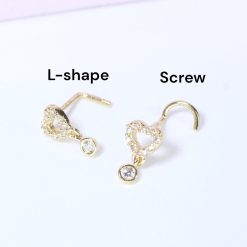 14K Gold Heart Nose Stud, 20g Dainty Dangling Gem L Shape Corkscrew Nose Stud, Gold Nose Jewelry, L Bend Screw Nose Piercing Stud Ring